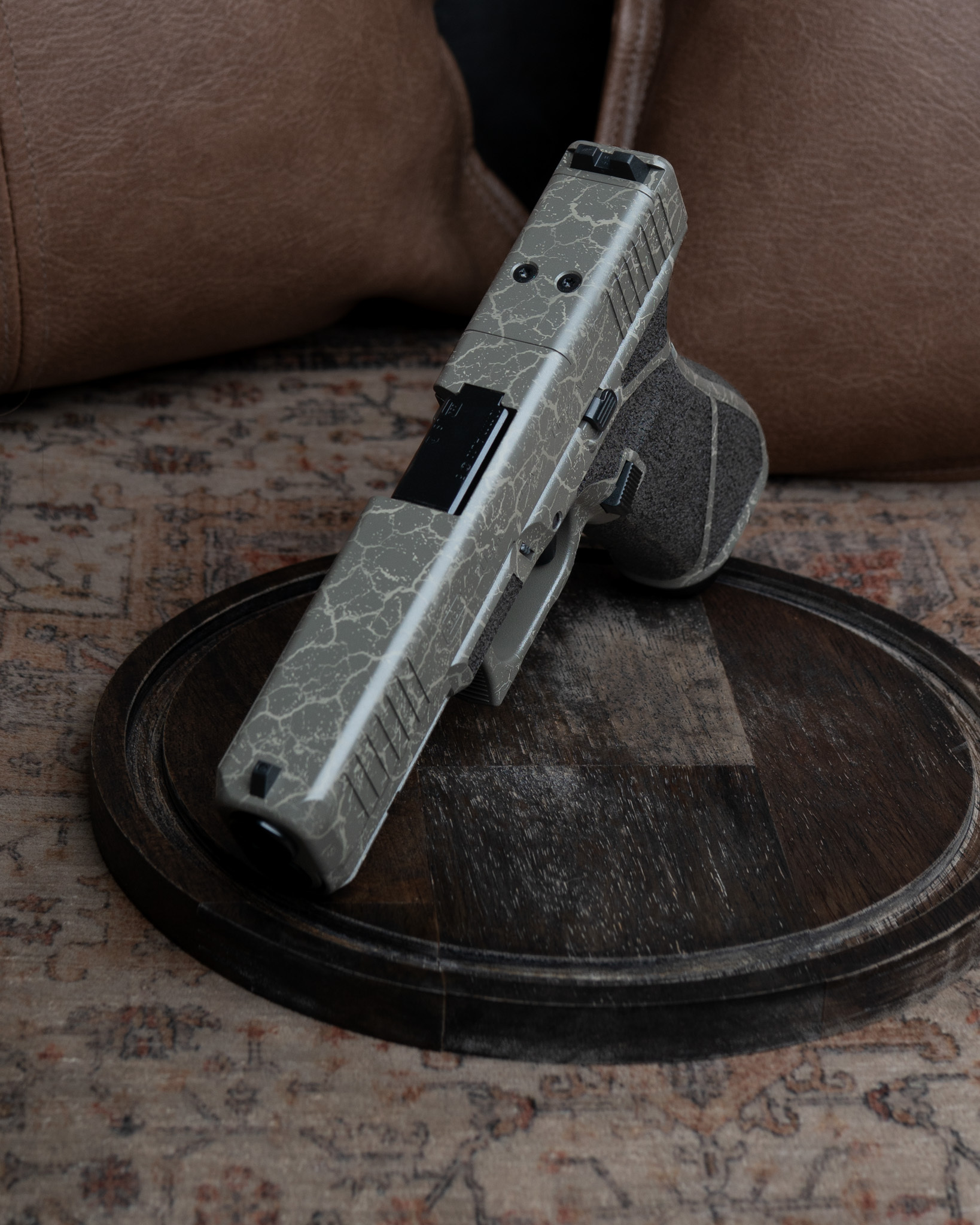 We start by carefully removing the factory texture and by polishing the polymer to ensure that the areas where we will be applying the stippling will be smooth. After preparation, your frame is placed under our high-powered fiber laser and your choice of our stippling texture is applied by burning material away from your frame. This gives you a significant improvement over the factory texture and makes your frame more abrasive and easier to keep on target.