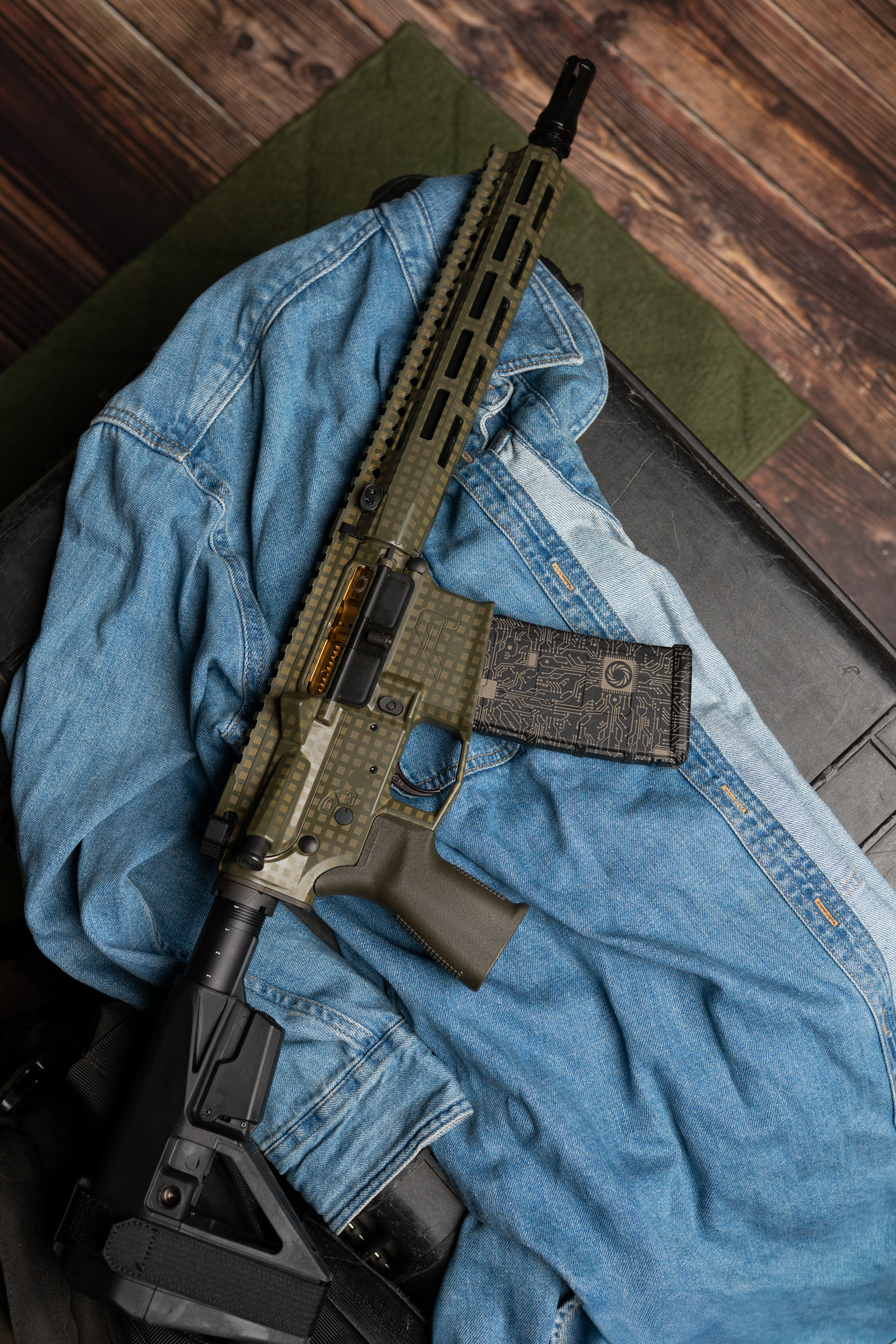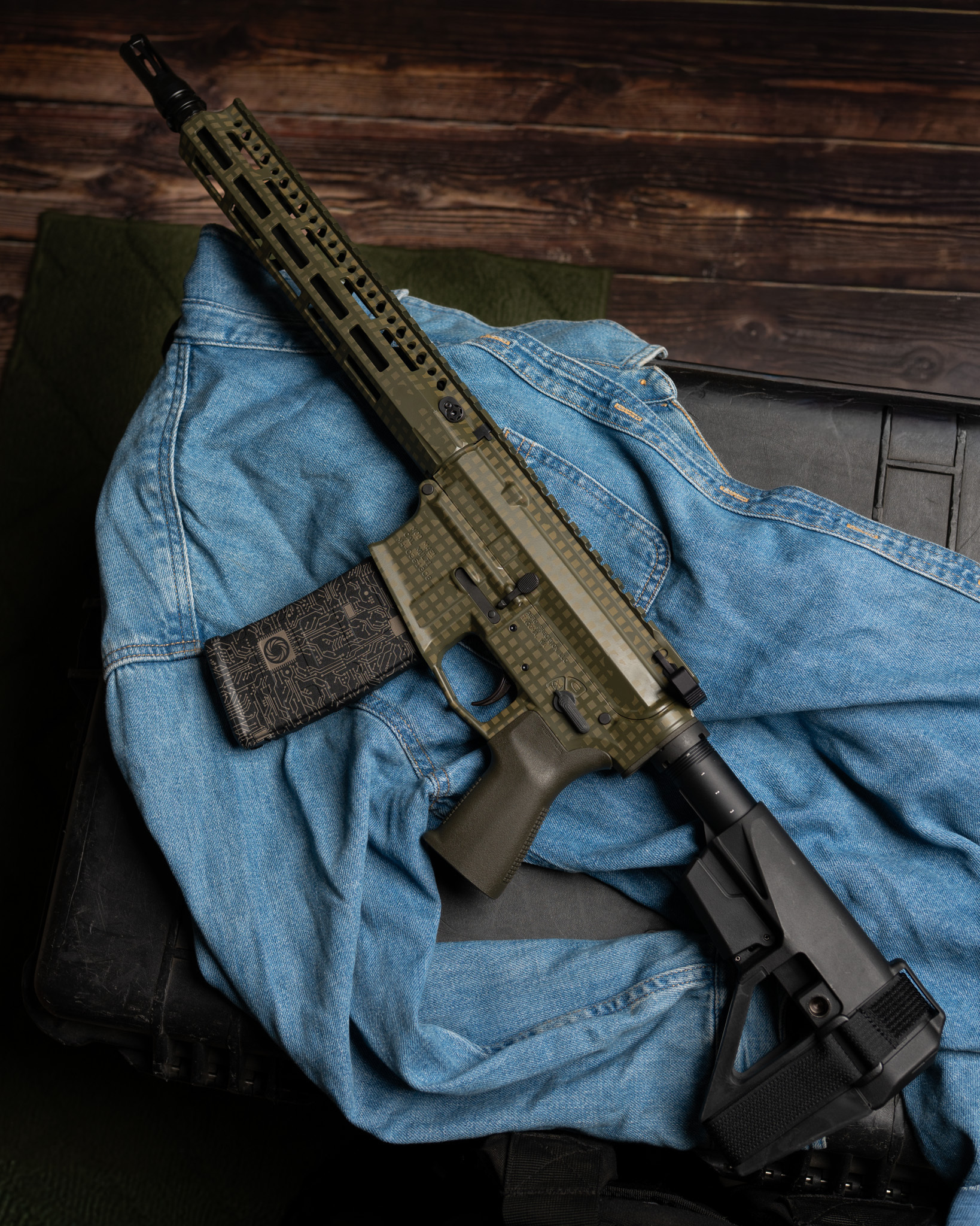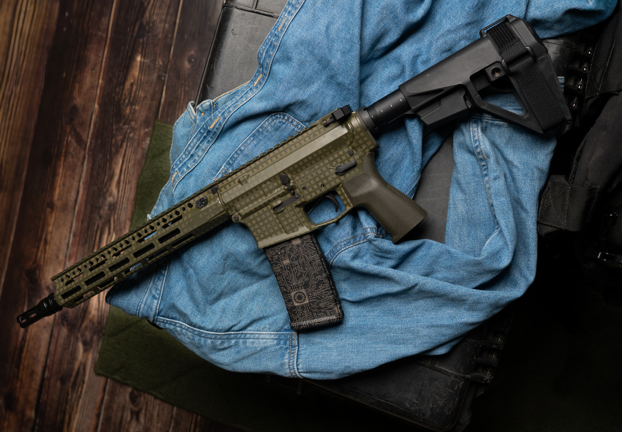 Check our WWLLC Custom Pistol equipped with our DNC camo. Some of materials in this list are: Foward Control Design Keymo muzzle device, BCM handguard, Aero m4e1 Lower and upper receiver, Cryptic BCG, Vltor a5 Buffer system including the new SBA 5 Tactical Brace, also a Gieselle Trigger. Plus, many more features.
